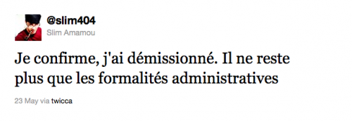 J’ai tenu mes engagements immédiats, j’ai réfléchi encore, et j’ai rappelé le président pour lui confirmer ma décision. J’ai démissionné un vendredi, et j’avais une émission de radio prévue le lundi matin (sur Express FM, ndlr). Le président voulait que je lui laisse le temps de parler avec le Premier ministre, et que je ne m’exprime pas sur le sujet avant le lundi soir. Là-dessus, le présentateur radio m’apostrophe en me demandant si ma mission en Tunisie est terminée. Je lui réponds que oui, et je lui annonce que je vais démissionner. L’information est sortie, les gens ont commencé à la tweeter, et les 140 caractères aidants, “Slim va démissionner” est devenu “Slim a démissionné”. J’ai aussi commencé à lire que j’avais quitté mes fonctions pour les mêmes raisons que Rajhi, parce que je croyais à l’existence d’un gouvernement de l’ombre.